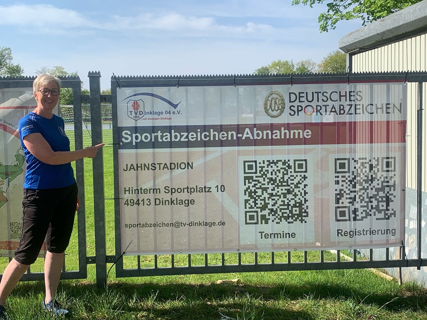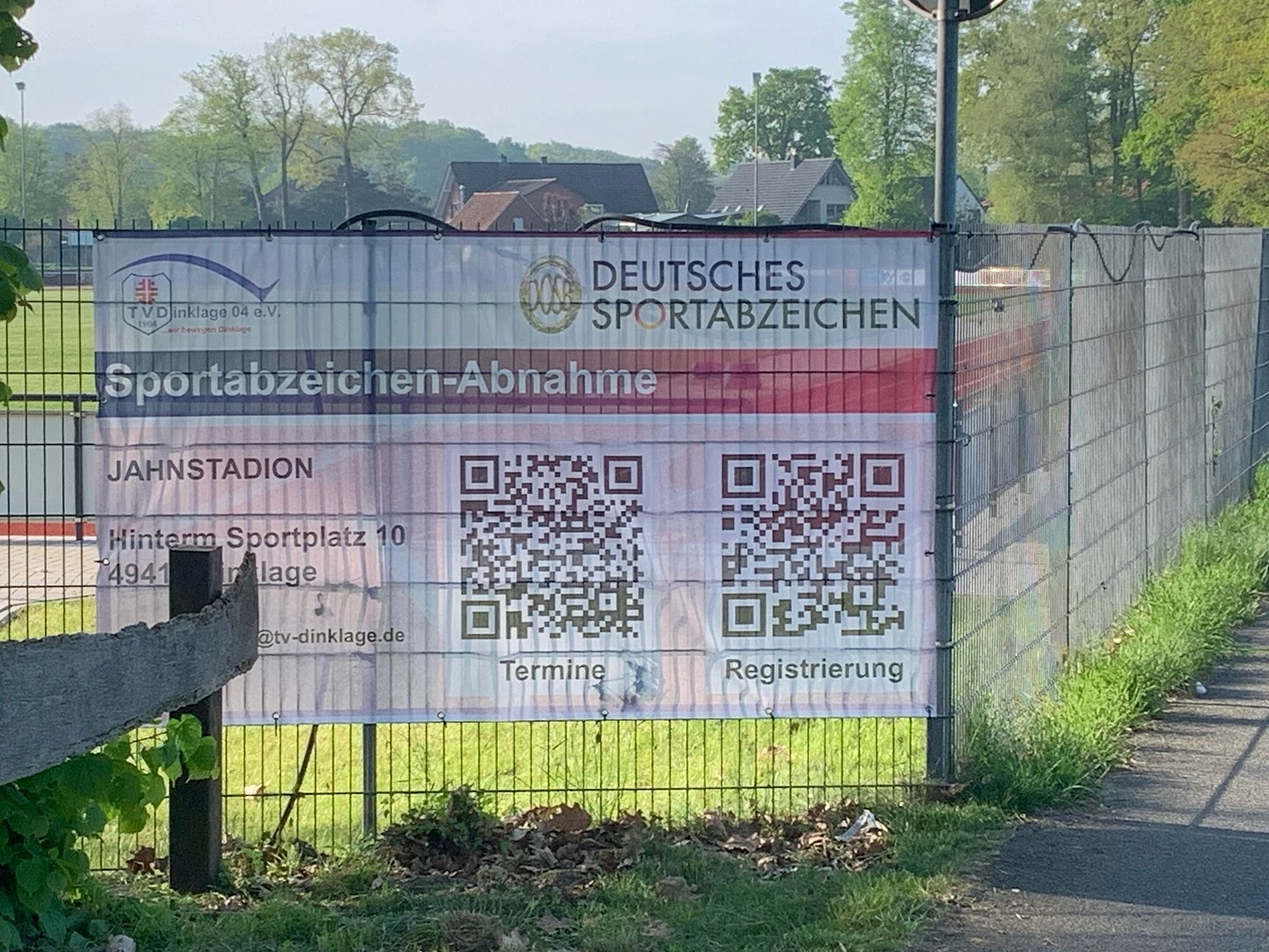 unsere neuen Banner hängen am Jahnstadion. Mit dem scannen des QR Codes findest du alle Termine zur Abnahme des Sportabzeichens und kannst dich darüber auch schon direkt registrieren.