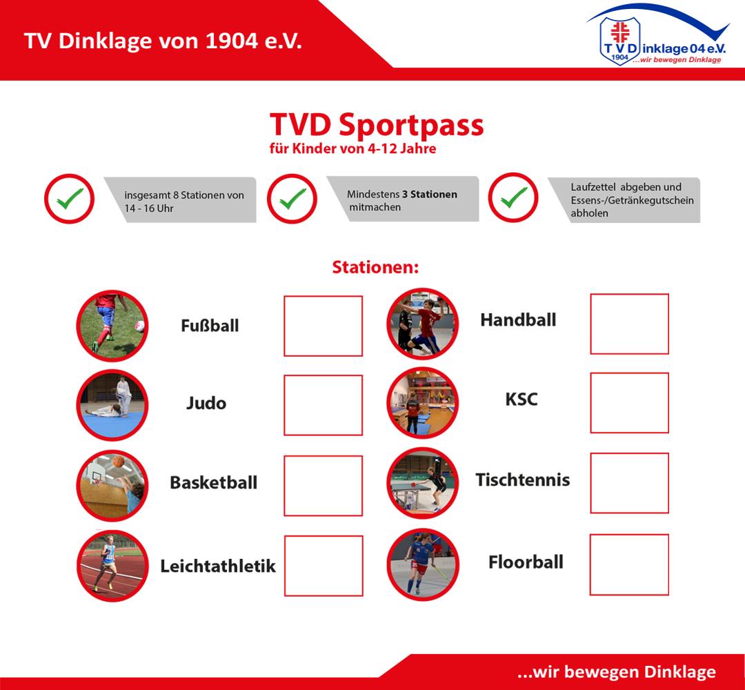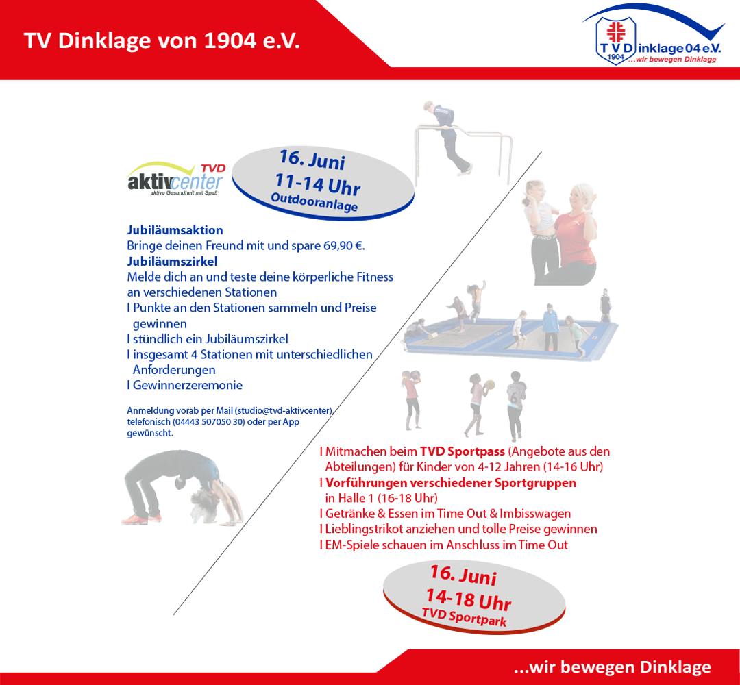 Das @tvdaktivcenter startet um 11 Uhr mit einem Jubiläumszirkel auf unserer Outdooranlage. Von 14-16 Uhr können Kids im Alter von 4-12 Jahren mit einem Sportpass (Bild 2) verschiedene Sportarten erleben und ab 16 Uhr präsentieren wir euch Vorführungen (Bild 3) aus unseren Sportangeboten. Im Anschluss lassen wir den Tag im @tvd_timeout ausklingen.
