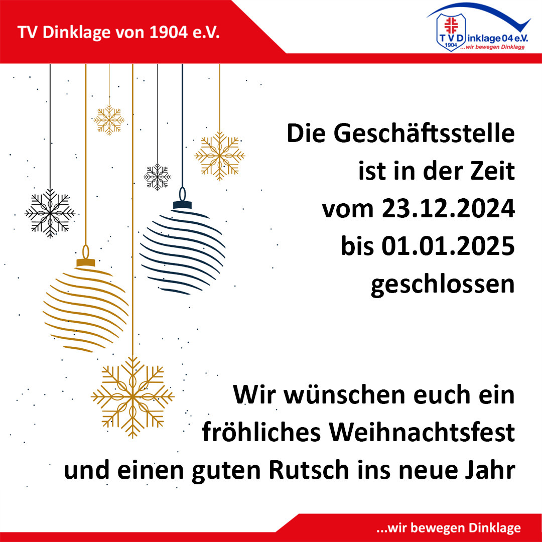 Die Geschäftsstelle ist in der Zeit vom 23.12.2024 bis einschließlich 01.01.2025 geschlossen.