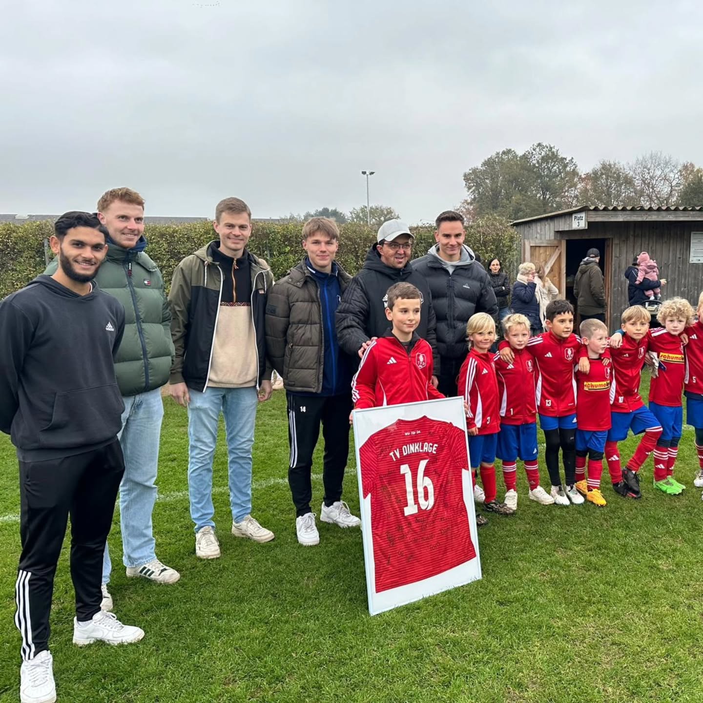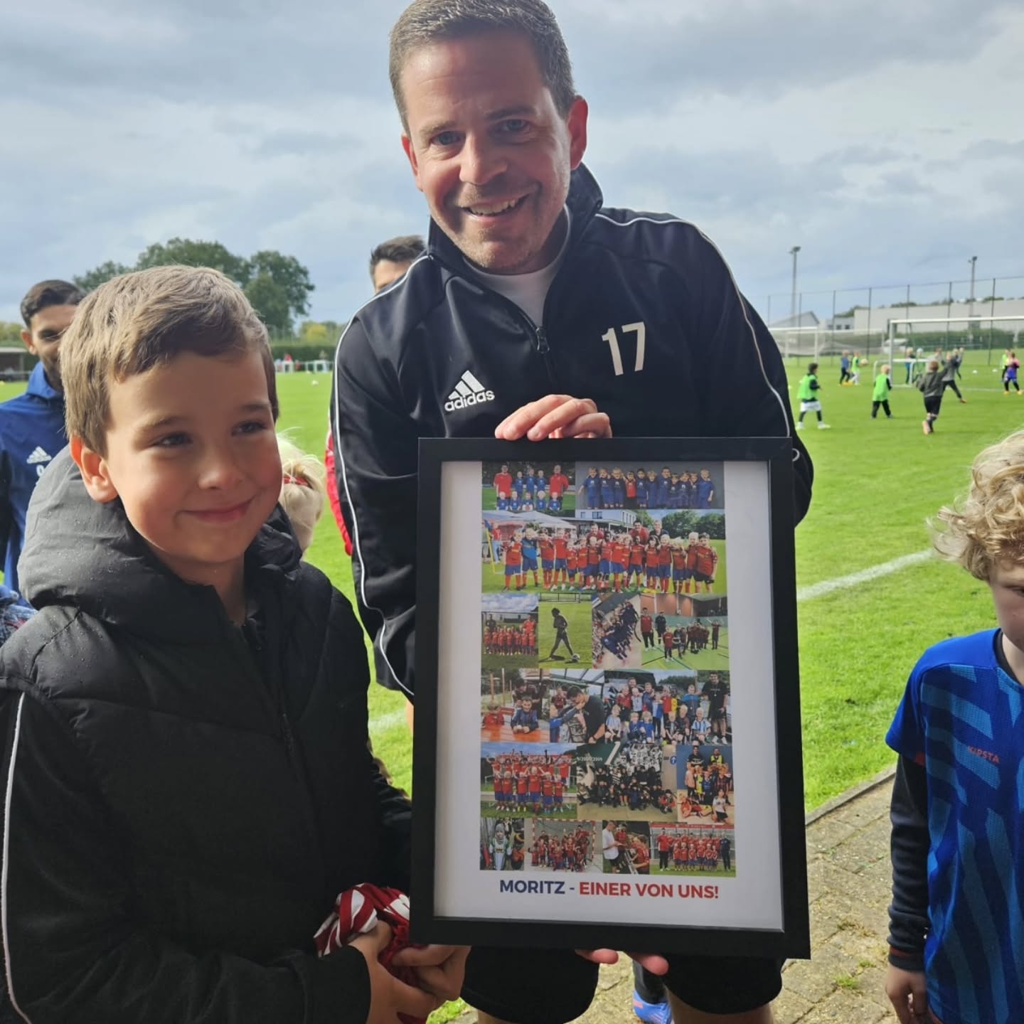 Aber es gab noch einen anderen Grund, weshalb eine Auswahl der 1.Herren sich auf den Weg machte , um die 2.F zu unterstützen. Sie hatten nämlich mitbekommen, dass vor einigen Wochen ein Spieler aus der Mannschaft aufgrund von Wachstums-Problemen in der Hüfte seinen Traum vom Fußball ganz weit nach hinten schieben und evtl. sogar aufgeben muss. Dies wird sich in den nächsten Monaten zeigen. Die Paten der Mannschaft Rivaldo Mitkov und Oliver Schlundt haben sofort reagiert und Moritz zusammen mit der einer Abordnung der 1.Herren überrascht. Sie überreichten ihm ein originales Trikot der 1.Herren, auf dem das gesamte Team unterschrieben hatte.