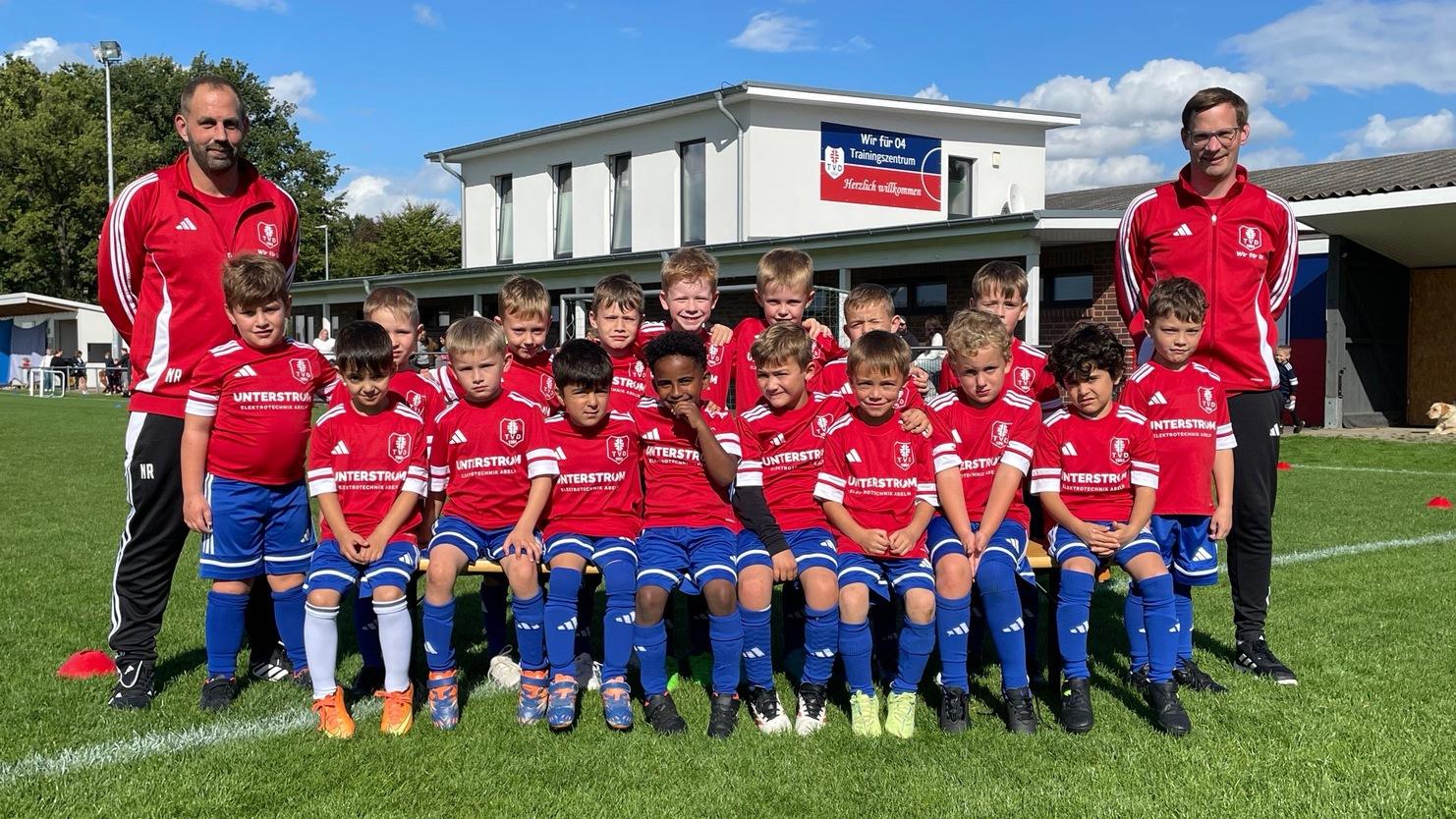 Hinten v.l.: Nico Rolfes (Trainer) Pelè Leon Kreymborg, Luca Maxim Farber, Danil Sokolowski, Mats Schnieders, Leonard Bünnemeyer, Johan Behrens, Philipp Rode, Elian Önder, Tobias Rolfes (Trainer)