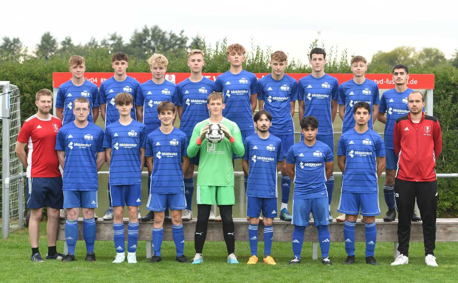 Hinten v.l.: Hennes Kruthoff, Leon Schlarmann, Leonard Bohmann, Maximilian Groothuis, Erik Steinacker, Hannes Barklage, Ben Nösing, Janne Brinkmann, Aiham Bakkour