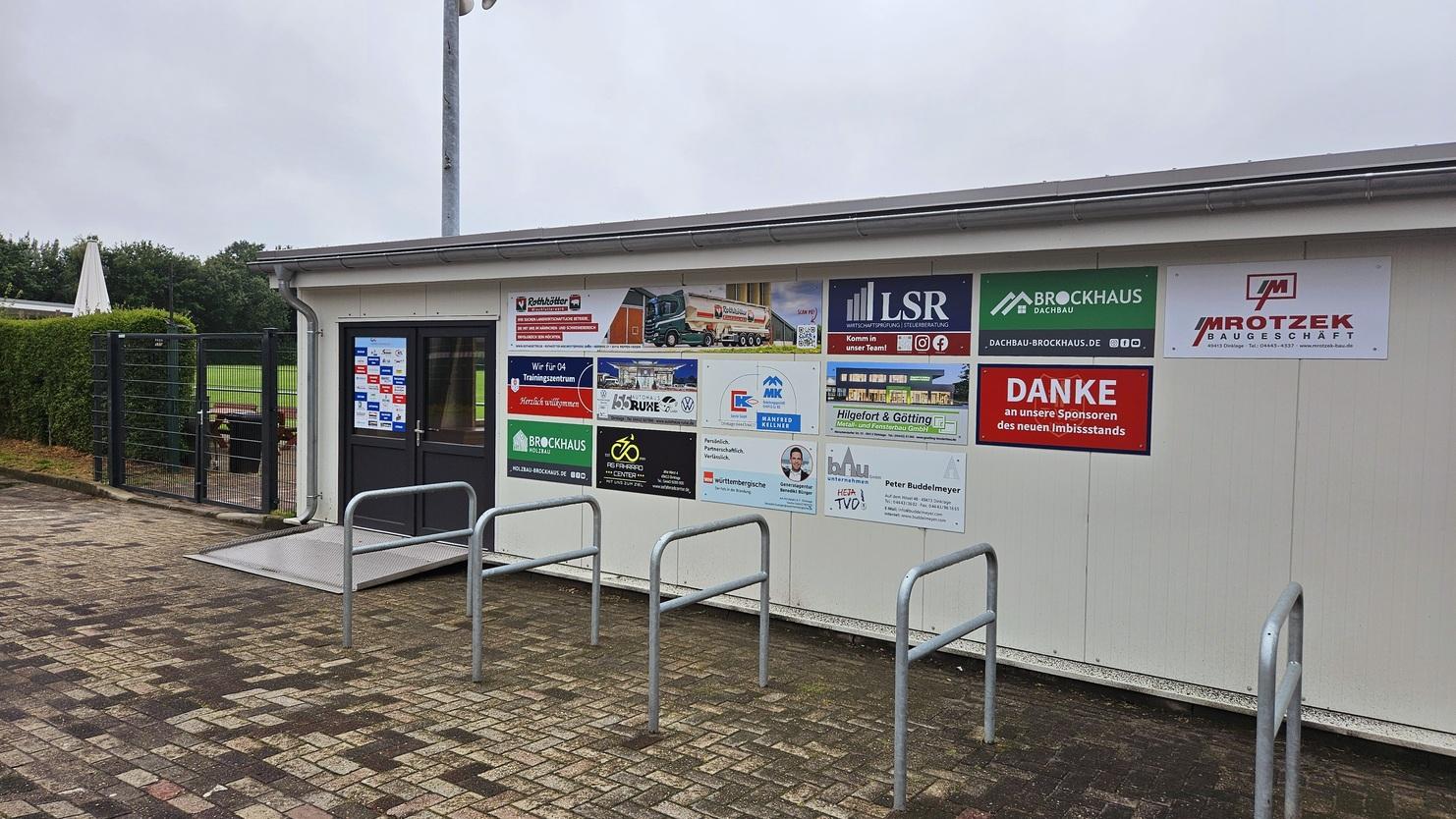 Auf der Ostseite des Imbissstandes, also vom Schützenweg kommend im Eingangsbereich zum Trainingszentrum wollen wir heimischen Firmen die Möglichkeit bieten, Werbeflächen zu mieten. Im Rahmen eines zweijährigen Sponsoring-Vertrages können Unternehmen gegen Erhalt einer Rechnung großflächig (z.B. 1,00 m in der Breite und 0,50 m in der Höhe) auf ihre geleistete Unterstützung bei Errichtung des Imbissstandes und/oder auf die Unterstützung des Jugendfußballs hinweisen.