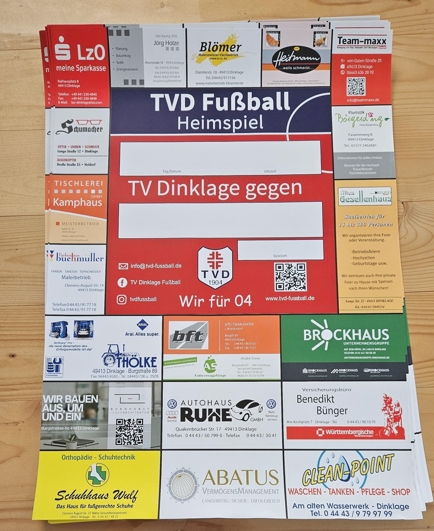 Zu allen Heimspielen unserer 1.Herren und wichtigen Spielen unserer anderen Mannschaften werden in der Stadt Dinklage Plakate mit der Ankündigung dieser Spiele verteilt. Auf diesen Spieltagsplakaten kannst du mit deinem Firmenlogo werben.