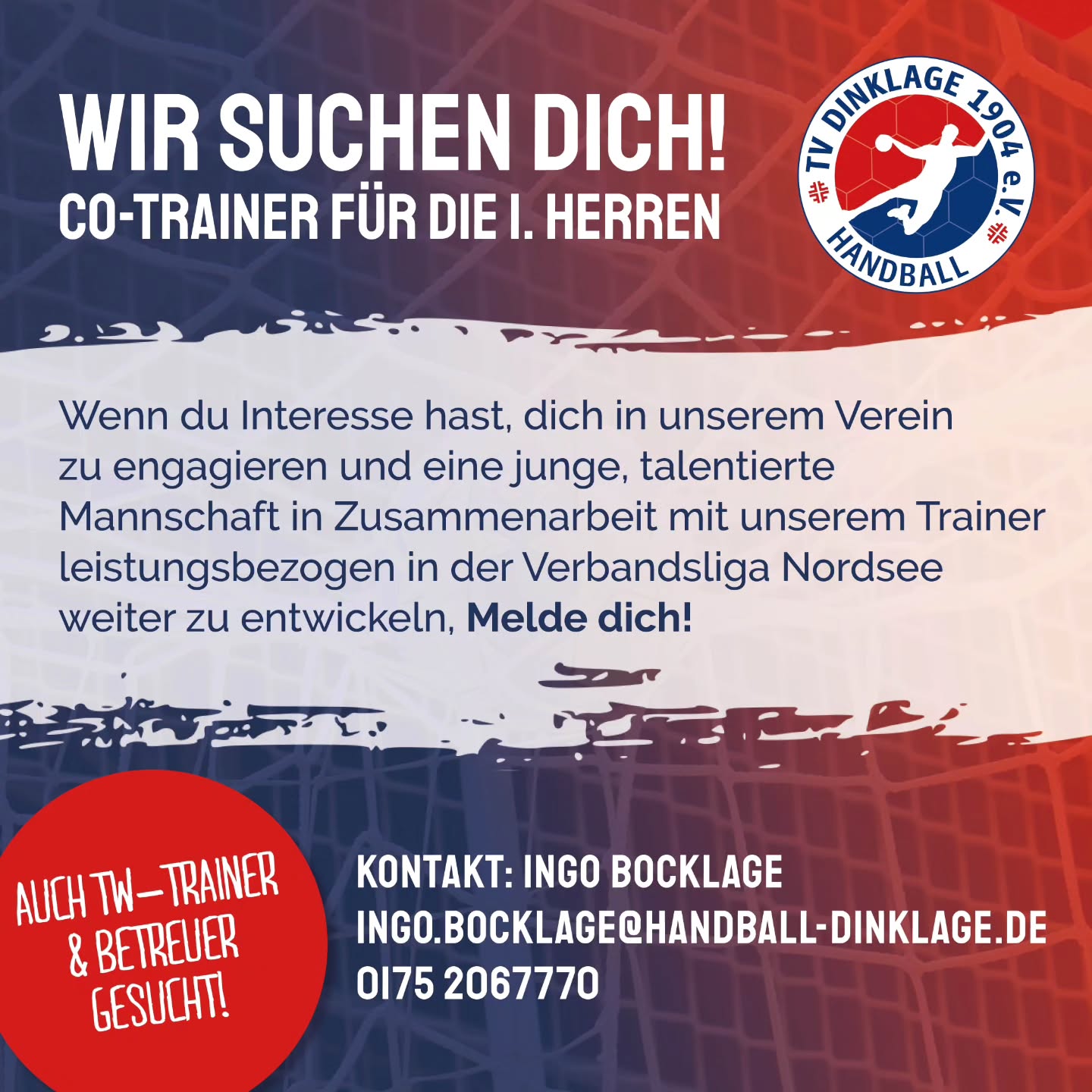 Für das Aushängeschild unserer Abteilung und den amtierenden Meister der Landesliga West, suchen wir Verstärkung in unserem Trainerteam. Wenn du dir vorstellen könntest unsere 1. Herren in der kommenden Saison als TW-Trainer, Betreuer oder Co-Trainer an der Seite von unserem Trainer Markus Gabler in der Verbandsliga Nordsee zu unterstützen, melde dich gern bei unserem Abteilungsleiter. Wir heißen dich in der großen TVD-Familie willkommen und freuen uns auf jeden neuen Input für unsere Abteilung und unsere 1. Herren.